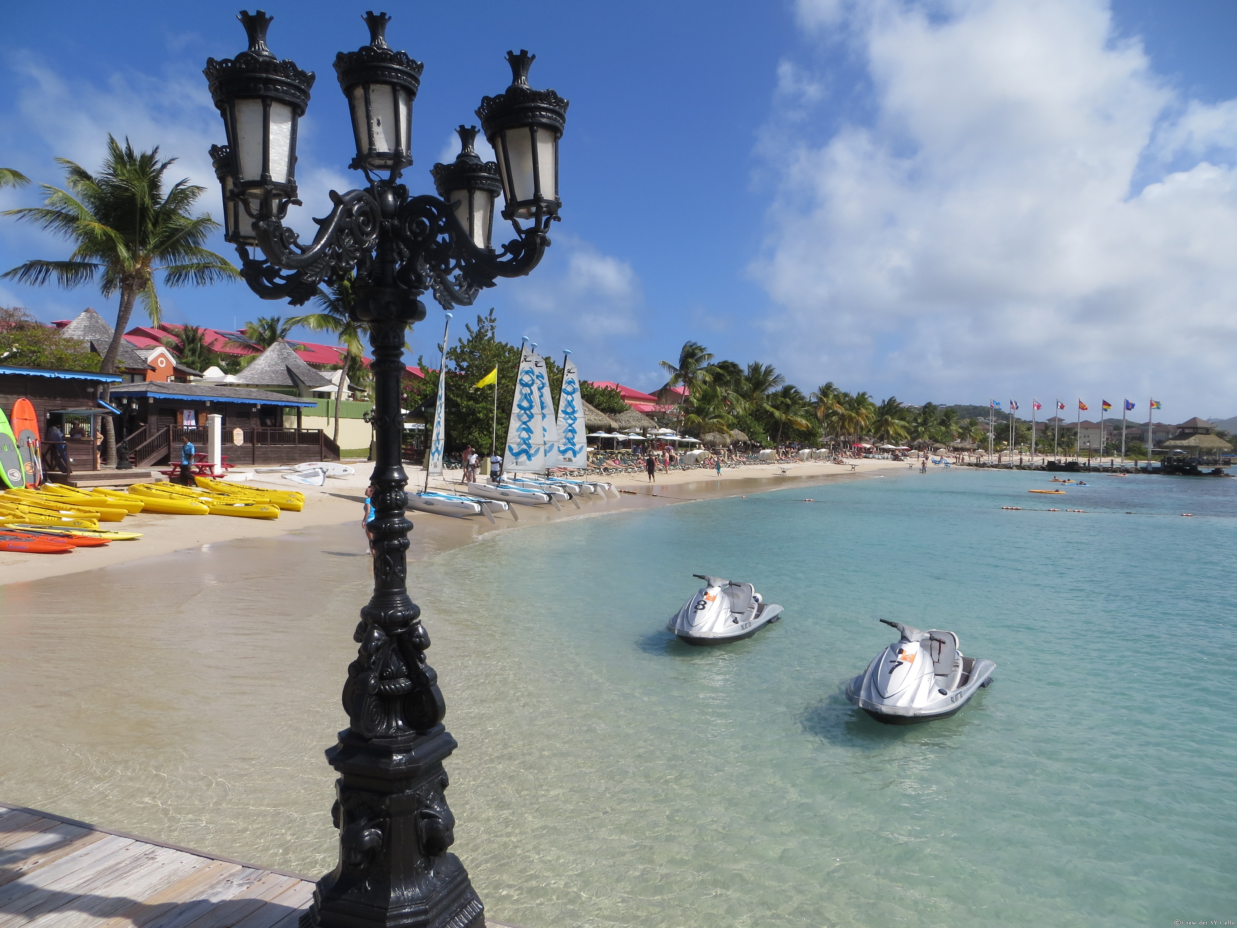 Lange haben wir darauf gewartet, letztendlich sind unsere Wanten dann am Freitag wirklich in der richtigen Länge geliefert worden. Wir haben sie montiert und gespannt und sind dann abends mit Antje und Ingo auf das Wöchentliche Straßenfest in Gros Islet gegangen. Es war, wie jede Woche. Lauter tanzende Touristen und Einheimische, gerilltes Huhn und Rum-Punch. Als Abendessen gab es für die meisten von uns Schwertfisch, wobei Ingo’s Fisch leider überhaupt nicht durch war. Ingo und Antje sind dann relativ früh gegangen, da sie Tagsüber mit dem Taxi die Insel erkundet haben und somit ziemlich müde waren. Und so haben wir dann unser vorerst letztes „Jump Up“ wieder zu dritt erlebt. Einen weiteren Bericht zu diesem Abend findet ihr auf dem Blog der Amazone (Die Cellisten).