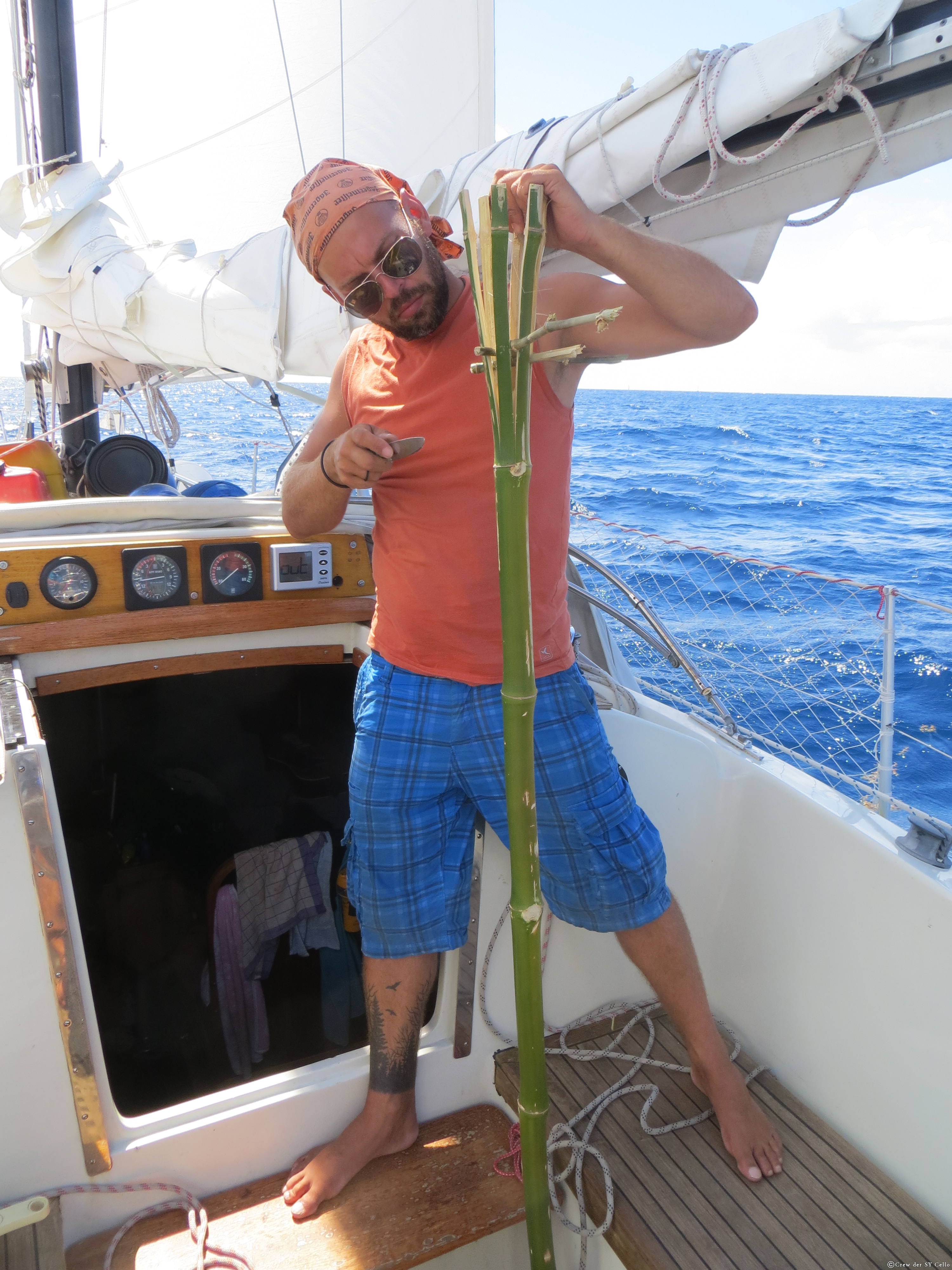 Am nächsten Tag sind wir für unsere Verhältnisse relativ früh am Morgen in den Süden aufgebrochen. Wir haben uns als Zwischenziel eine kleine Bucht ausgesucht, wo man super schnorcheln können soll. Siggi hat sich unterwegs dorthin aus einem Bambus-Stock einen Speer gebaut. Bis wir in der Bucht waren, war der Speer so gut wie fertig. Doch dann hat er das Messer gegen die Taucherbrille und Flossen getauscht und ist schnorcheln gegangen. Raimund und ich haben das klare Wasser der Bucht genutzt, um das Schiff von unten zu inspizieren und die Schraube und den Rumpf vom Bewuchs zu entfernen. Danach gingen auch wir schnorcheln. Hat sich wirklich gelohnt, eine Menge bunte, kleine und auch größere Fische.
